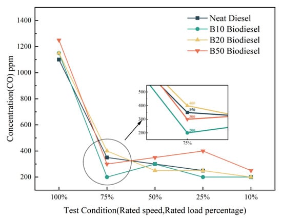 The changes in gas phase exhaust pollutants and soot under different mixing ratios and operation conditions are demonstrated in Figure 5, Figure 6, Figure 7 and Figure 8. The CO emissions at rated speed and different rated loads are represented in Figure 5. It can be seen that B10 has the most obvious effect on reducing CO emissions under different loads. Diesel has the most CO emissions at 100% rated load. CO emissions decrease sharply when the load reduces from 100% to 75%, while CO emissions from 75% to 10% rated load fluctuate little. When the engine operates at 100% load, the fuel consumption is significantly high. This is evident from Figure 5, where the concentrated mixture’s incomplete combustion due to insufficient oxygen leads to a rapid surge in CO emissions. In particular, the CO-specific emissions of B10 decreased by 42.86% at 75% load compared to neat diesel, while that of B50 increased by 60% at 25% load. The formation of CO is primarily influenced by oxygen concentration and serves as an indicator of complete combustion. At loads exceeding 20%, the high combustion temperature within the cylinder results from significant fuel injection. At this time, the oxygen concentration is the main influencing factor of CO formation. The neat conventional fuel itself does not contain oxygen, while the oxygen-containing characteristics of biodiesel itself improve the anoxic condition and reduce CO emissions. When the load is less than 20%, compared to that of diesel oil, the higher viscosity of biodiesel [43,44] has caused difficult fuel atomization and incomplete combustion. An increase in CO formation may be attributed to this factor [45].