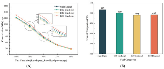 NOX Emissions at different rated loads and Exhaust Temperatures compared to biodiesel blends. (A) Concentration (NOX); (B) Exhaust temperature.