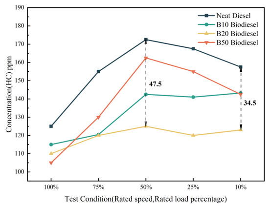 Figure 8 illustrates the HC emission at rated speed and different rated loads. As the load decreases, HC emissions increase first and then decrease. When the load is 50%, HC emissions reach the maximum. When the load is 100%, HC emissions are minimal. The most obvious is that when the load is 50%, the HC emission of B20 is reduced by 27.54 % compared with neat diesel. In addition, HC-specific emissions of tung oil-based biodiesel blends were all reduced, especially for B20, which decreased by 21.90% at 10% load. However, overall, the B20 shows the best performance, with the most significant reduction in HC emissions. With a low blend ratio, the fuel-bonded oxygen improves mixture quality, thus more complete combustion and less HC and particulate emissions.