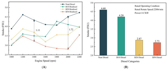 Smoke at different speeds compared to biodiesel blends. (A) Smoke at different speeds compared to biodiesel blends; (B) Smoke of different biodiesel in rated working conditions.