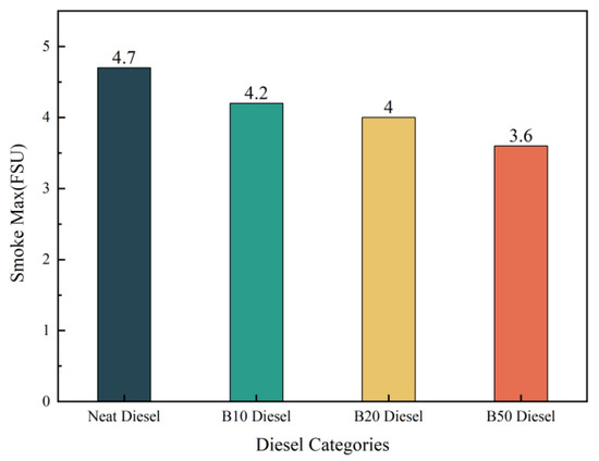 Figure 9A exhibits the change in the smoke emission of tung oil-based biodiesel with different speeds of rated power. As can be seen from the figure, usually at 1200 r/min and 2200 r/min, smoke emission is the highest. B20 and B50 smoke emission for ordinary biodiesel has a significant reduction. In particular, Smoke emissions decreased with an increasing percentage of tung oil added, especially for B50, which decreased by 38.05% at 2000 rpm. Figure 9B shows the change of smoke of different biodiesel at the same speed. In rated working conditions, the smoke degree (FSU) decreases sequentially with the increase in the proportion of tung oil. B50 is reduced the most, reducing by nearly 41% at a speed of 2200 rpm and power of 14.7 kW. Figure 10 shows the maximum smoke from different biodiesels.