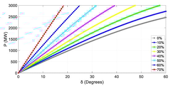 In practice, the series compensation degree typically varies from 25% to 75% [17,18]. For a fixed angular difference between the voltages at the line terminals, the transmission capacity increases with the compensation degree. According to [19], for the same transmitted power value, the angular difference decreases with an increase in the compensation level, resulting in improved dynamic stability of the system.