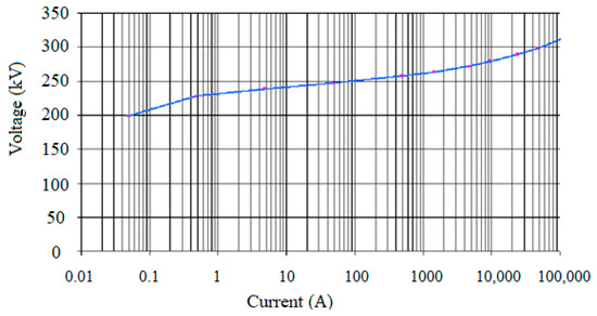 As they are connected in series with transmission lines, capacitor banks are subjected to voltage and current transients related to short circuits. It is essential to use a protection system to limit the voltage at the capacitor terminals and prevent equipment damage. In this regard, the protection system should be specified to limit the maximum overvoltage that each capacitor unit must withstand. For voltages below the determined limit, the CB should operate normally. According to [1], the metal oxide varistor (MOV) is among the main protection devices, characterized by its high nonlinearity. Figure 4 shows the operating curve of a MOV with a maximum withstand voltage of 283 kV to protect a 55.62 μF capacitor bank.