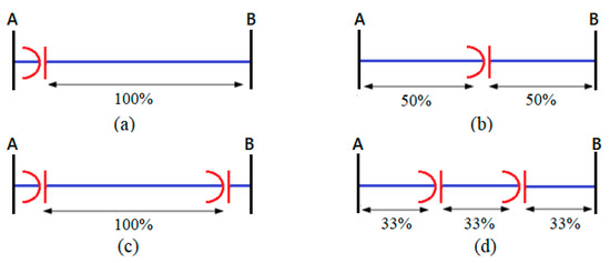 The location of the capacitor affects the voltage profile, which smoothly varies along the line with normal load current but undergoes a sudden change at the equipment location. As described in [5,20], the capacitor’s position also alters the line segment where a fault would cause voltage inversion, current inversion, or subsynchronous oscillation. The four general positions of the CB are shown in Figure 6. The equipment can be inserted at one or both ends of the line or along the line, such as at the midpoint or one-third of its length [21]. From the perspective of the voltage profile, placing capacitors in the middle of the line is more effective. However, in practice, compensation at the line’s ends is more common, as installing capacitors along the line requires the construction of a substation to accommodate the CB and its protection and control equipment.