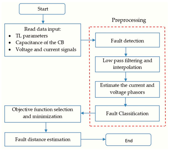 Before solving the fault location problem by minimizing the objective function, preprocessing routines are applied to prepare the data. Figure 7 presents the basic steps involved in the algorithm’s development.