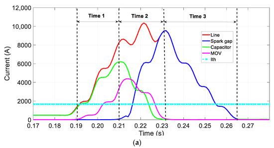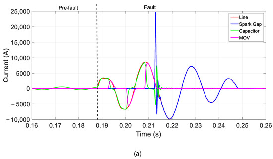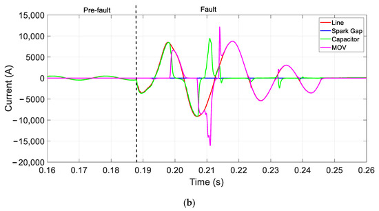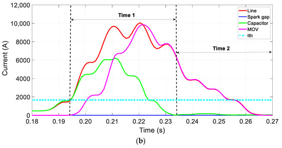 Figure 10 provides a detailed view of the currents in the transmission line, spark gap, capacitor bank, and MOV (The voltage–current characteristic is represented in Figure 4) for phases B and C, corresponding to the BC fault shown in Figure 9.
