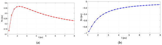 In Figure 13, the behavior of and can be observed. The current of 1 pu represents the maximum allowable value in the capacitor without varistor conduction, meaning the current is lower than . For values below Ipu, the model is equivalent to the fixed capacitor reactance of the compensation. Typically, the capacitor’s protective level current is equal to 2 to 2.5 times the rated current of the capacitor. If , the MOV is out of the circuit, and = −j.