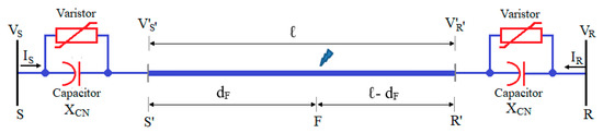 Determining the and are essential for the proposed formulation. , and values are input data. The current and the fault distance are considered problem variables. Figure 15 represents the transmission line from Figure 14 with the linearized models of the capacitor/MOV set.