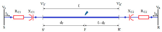 The voltage calculated along the line from points S’ e R’ is obtained by Equations (18) and (19), where γ is the propagation constant and is the characteristic impedance.