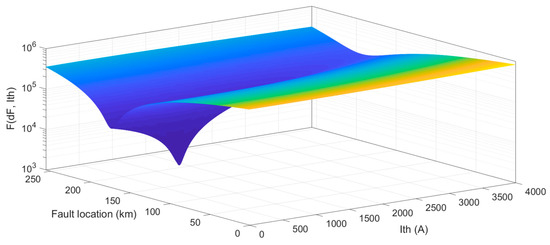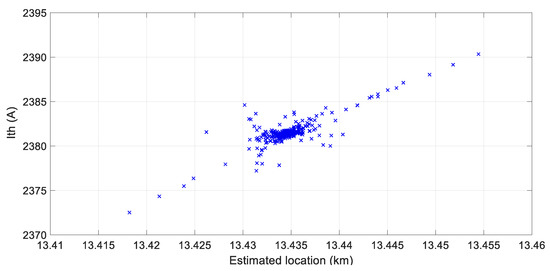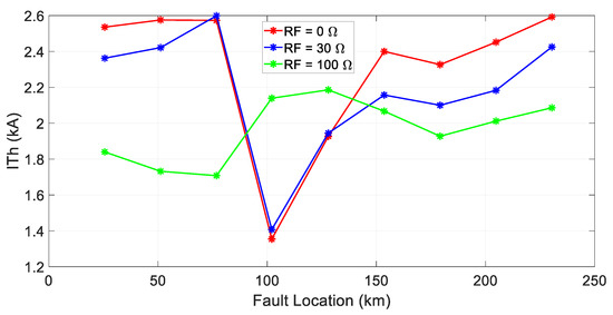 Figure 23 shows the current threshold for MOV—Ith which was obtained in the minimization of the objective function for the AG faults in Figure 22. The MOV remains the same for all simulations; however, the value of Ith, due to errors in the data preprocessing process and the minimization of the objective function, is estimated with different values, but around 2000 A. The errors obtained in the fault location process are less than 1.3%, even for high fault resistance values, which is acceptable in this engineering problem.