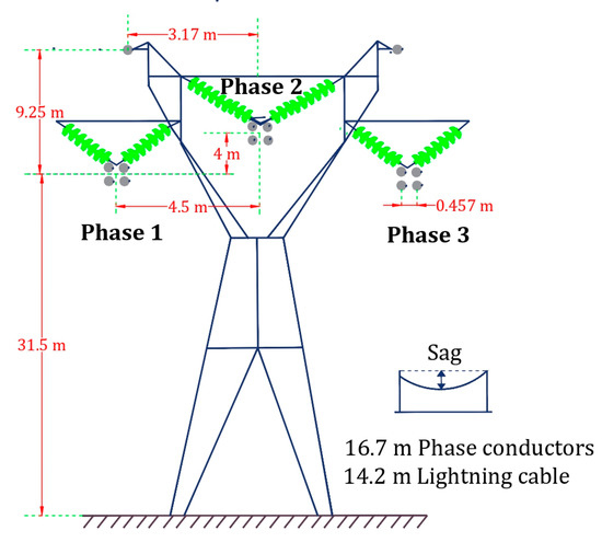 The electrical system used to generate the results of the proposed methodology is based on data from a 256 km transmission line in the central–west region of Brazil. The single-line diagram and the typical tower are represented in Figure 17 and Figure 18.