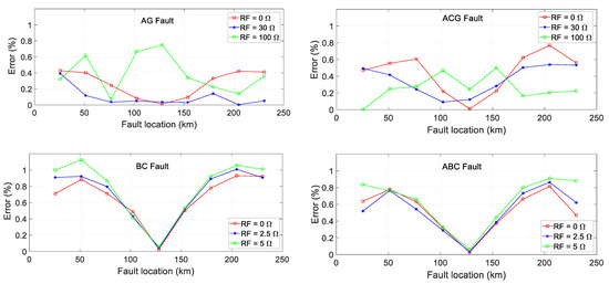 Figure 22 shows the percentage location errors obtained for BC, ABC, AG, and ACG faults, simulated every 10% of the 256 km transmission line length, calculated as a function of the total transmission line length, according to Equation (26).