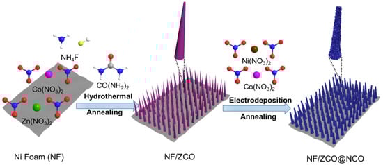 A schematic diagram depicting the synthesis process of ZnCo2O4@NiCo2O4 (NF/ZCO@NCO) is presented. Reproduced with permission from [48].