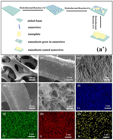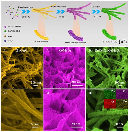 (a’) Synthesis schematic (a–c) Low-magnification SEM images and (d–f) the corresponding high-magnification SEM images. Reproduced with permission from [51].