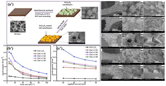 (a’) Schematic representation of the synthesis of CdS-coated ZnCo2O4 nanostructure; variation of areal capacity (b’) with respect to scan rate; (c’) with respect to applied current; SEM images of ZnCo2O4 (a–c), ZnCo–CdS2 (d–f), ZnCo–CdS4 (g–i), ZnCo–CdS6 (j–l), and ZnCo–CdS8 (m–o) at different magnifications (the research team varied the number of CdS SILAR cycles onto the ZnCo2O4-coated Ni foam, with 2, 4, 6, and 8 cycles being used. The electrodes resulting from these cycles were identified as ZnCo-CdS2, ZnCo-CdS4, ZnCo-CdS6, and ZnCo-CdS8, respectively). Reproduced with permission from [59].
