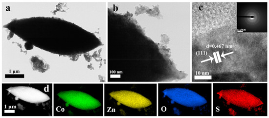 (a,b) show TEM images, while (c) displays a HRTEM image, and panel (d) shows a HAADF-STEM image and elementary mappings of S-ZnCo2O4. The SAED pattern is inset in (c). Reproduced with permission from [61].