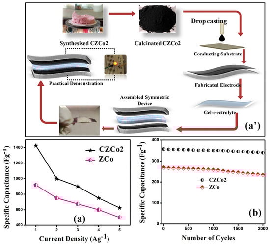 (a’) This figure depicts a schematic illustration of the device. (a) shows the variation of specific capacitance with respect to current densities, while (b) displays the cycling performance of the ZnCo2O4 (ZCo) and Co-doped ZnCo2O4 (CZCo2) samples at 10 A g−1. Reproduced with permission from [63].