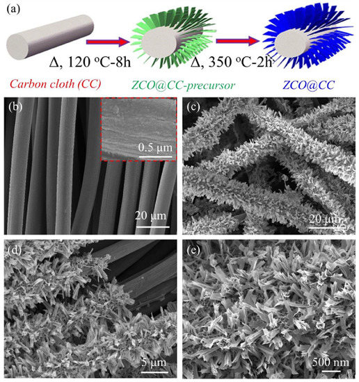 (a) illustrates the process of synthesizing mesoporous ZnCo2O4 (ZCO) nanobelts. The carbon cloth was used as a substrate for the growth of nanobelts. The SEM image in (b) shows the carbon cloth without any coating, while (c) displays a low-resolution SEM image of ZCO nanobelts on carbon cloth. The cross-sectional view of the nanobelts on carbon cloth depicted in (d,e) shows a high-resolution SEM image. Reproduced with permission from [68].