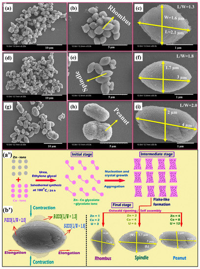 FESEM images (a–c) rhombus ZnCo2O4, (d–f) spindle ZnCo2O4, and (g–i) peanut-like ZnCo2O4 samples (a’) Formation mechanisms for the self-assemblies of rhombus-, spindle-, and peanut-like ZnCo2O4 microstructures, (b’) Comparison of the dimensions of the three ZnCo2O4 samples. Reproduced with permission from [74].