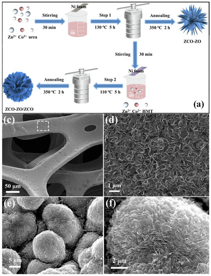 (a) A synthetic representation of microspheres composed of ZnCo2O4-ZnO (ZCO-ZO) and a composite structure with a hierarchical ZnCo2O4-ZnO/ ZnCo2O4 (ZCO-ZO/ZCO) core-shell microarchitecture. (c,d) Scanning electron microscopy (SEM) images of pure ZnCo2O4 (ZCO) (the white box in (c) was the focused portion to obtain (d)). (e,f) SEM images of the ZnCo2O4-ZnO/ZnCo2O4 (ZCO-ZO/ZCO) composites. Reproduced with permission from [77].