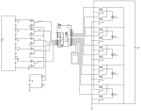 The configuration of the charge optimization system is presented in Figure 2. The cascaded batteries are connected separately in a relay for each battery; the function of the relay is to allow the charging of the batteries individually. A voltage divider is used through configuring resistors to measure the level of each battery and reduce its voltage. The Arduino controller can interpret the voltage values, census each battery’s voltage level and activate the charge to the battery with the lowest voltage; the charge and discharge data will be stored for later interpretation.