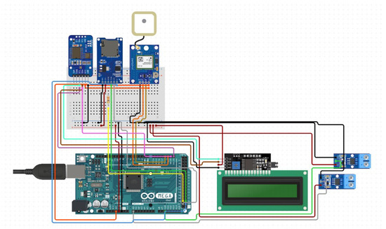 The system shown in Figure 3 comprises a central controller (Arduino mega 2560) that converts the voltage values obtained from the sensors. The ACS712 sensors interpret the current values as voltage [63]. These values are converted by the ADC of the central controller at 10 bits into current values through the programming set for their respective visualization on the LED display. The current and irradiance values are stored on an SD card for further analysis. In addition, the system has a GPS module to establish a relationship between the generated load, the solar collection environment and the position