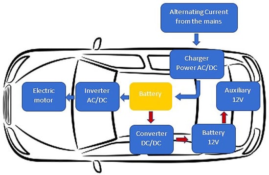 This type of vehicle no longer has a combustion engine and moves its wheels utilizing one or more electric motors, so this model has a fuel tank. EVs have approximately 90% fewer parts than internal combustion vehicles. The main component of the electric vehicle is the battery, which includes a series of auxiliary components that allow it to operate, as shown in Figure 5.