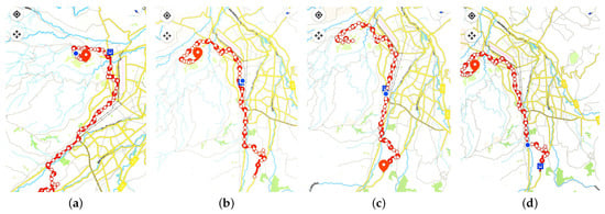 Figure 6. Study Routes-Andean City: (a) First trajectory_(Trigales). (b) Second trajectory_(Downtown). (c) Third trajectory_(Ave. Americas). (d) Fourth trajectory_(Ordoñez Lasso–San Joaquin).