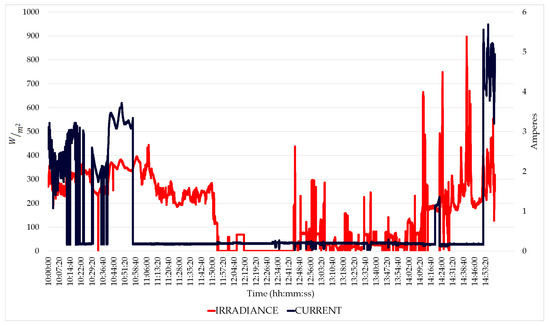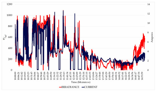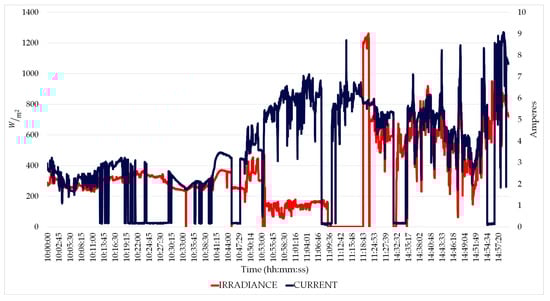 Figure 7 shows the results obtained from the respective measurements, in which the relationship between the current generated and the respective incidence of radiation collected during the route established in Section 2.4, obtained on a sunny day, is considered favorable.