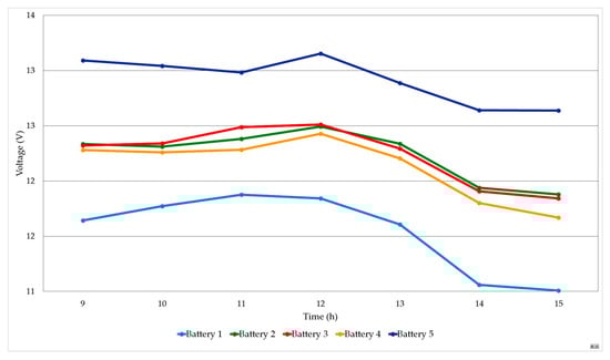 Figure 8. Favorable day: Cascading voltage behavior of the five batteries.