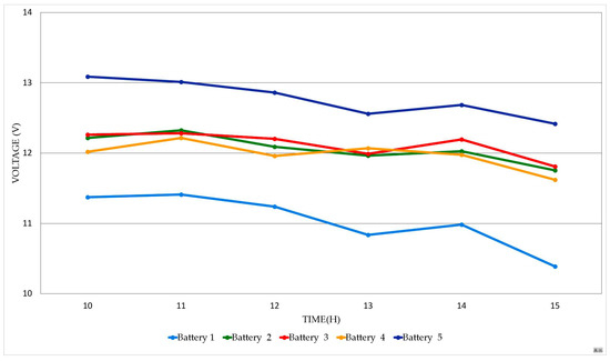 Figure 8 shows the voltage compensation generated in each of the five batteries, reaching high voltage levels to charge the batteries. Likewise, the inflection points where the battery reaches small voltage values can be observed; however, there is a recovery of the battery charge, and the behavior is similar for all batteries. On this day, a range of 70 km was achieved, which exceeds the estimated range of 50 km of the vehicle.