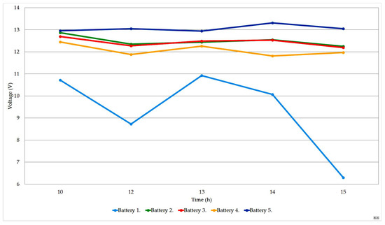 Figure 12 presents the comparative of the voltage values obtained for each electric vehicle battery. It is possible to notice the low values of voltages due to the adverse conditions of the day.