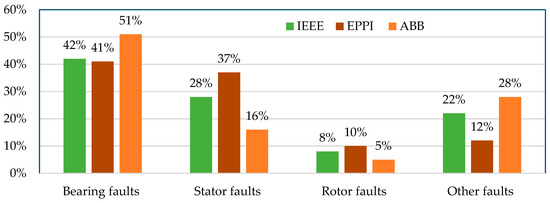 Three institutions, named the Institution of Electrical and Electronics Engineers (IEEE), Electric Power Research Institute (EPRI), and Asea Brown Boveri (ABB), have evaluated the IM fault types and their performances. Their surveys, which are depicted in Figure 3, reflect the importance of condition monitoring and diagnostics in different parts of motors, and show the percentage contribution of the faults related to motor’s stator, rotor, bearing, and other related considerations [33,34].