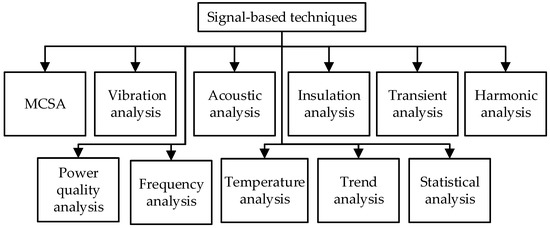 Fault diagnosis methods are mainly divided into categories, i.e., signal processing and model-based techniques. Signal-based techniques for condition monitoring and fault diagnosis of electrical machines involve analyzing various signals acquired from the machines to detect abnormalities, deviations, or fault signatures [31,70,71]. These techniques focus on extracting relevant information from the signals to assess the machine’s condition. Some common signal-based techniques are shown in Figure 4.