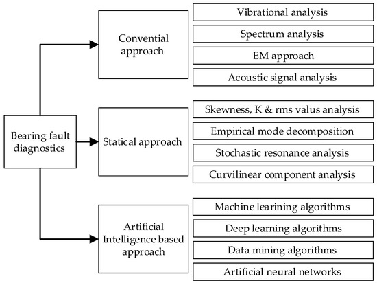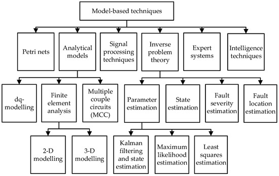 Model-based techniques for CM and FD of electrical machines are based on mathematical modeling to evaluate the behavior of the motor and detect the relevant faults or deviance from the common operating requirements [73,74]. The most common model-based techniques in FD are analytical models, finite element analysis (FEA), signal processing techniques, Kalman filtering (KF) and state estimation, artificial intelligence (AI), stochastic resonance, and machine learning (ML), as shown in Figure 5. These model-based techniques provide valuable tools for the CM and FD of electrical machines, allowing pre-condition of faults, predictive maintenance, legible reliability, and high performance. The divisions above can also be used in artificial intelligence (AI) based techniques for diagnostics. An artificial intelligence approach to predictive maintenance necessitates both human intelligence and machine learning or training of algorithms for machine fault diagnostics [75,76,77,78,79].