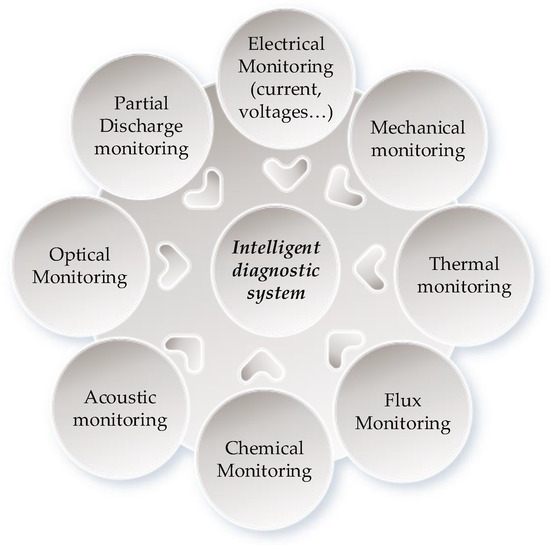 IM-related faults caused by high-frequency inverter transients and behavior that generate the faults. Academia, and industry are investing heavily in their research and development (R&D) related to condition monitoring and diagnostics [81,82]. Figure 6 shows a tie of an electric machine with an intelligent diagnostics system, which integrates the motor’s real-time parameters, for example, electrical, mechanical, flux, optical, acoustic, chemical, partial discharges, and others, to form a diagnostic [83,84,85].