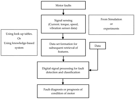 Today, industries utilize many electrical machines, particularly induction motors (IM), with wattages ranging from several watts to megawatts to convert electrical power to the required mechanical power. IM has a lower power-by-weight (W/kg) ratio than a synchronous machine of the same rating, has lower costs, is more durable, and requires less maintenance. Hence, they are known as the workhorse of the industry. They are more useful in about 80% of the industry’s operations, such as the petrochemical industry, vehicular technology, mining process, propulsion systems, aerospace, nuclear-reactor plants etc. Their healthy and continued operation is required, because motor failure can shut down the whole plant process. This situation will generate significant financial loss and should be avoided to the maximum extent. Hence, early detection of faults with appropriate condition monitoring and diagnostic techniques within the motor is always required in terms of all means of time and money [1,2,3].