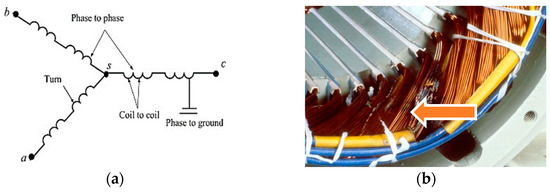 Stator faults in the induction motor account for approximately 16–37% of the total occurred faults [35]. Induction motor stator faults include winding faults and external drive faults. The stator winding fault (SWF) can be caused by turn-to-turn, coil-to-coil, phase-to-phase, or phase-to-ground faults, as shown in Figure 8. Most stator faults involve broken winding insulation. MCSA can detect broken thread insulation, which can cause phase insulation to break and kill the motor. Insulation is most affected by thermal stress [136]. The combination of different electric stresses generated through the transient voltages is particularly undesirable [137].