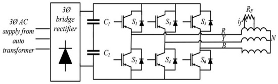 These inverters drive the IM while improving the operation’s safety and reliability, but increasing harmonic-frequency traces. The PWM modulation technique and switching frequency determine these harmonic amplitudes and wide-band frequencies. PWM-controlled inverters employed with WBG devices such as SiC (Silicon Carbide), GaN (Gallium Nitride), GaAs (Gallium Arsenide), AlN (Aluminum Nitride), etc. have critical switchinits g frequencies ranging from a few kHz to tens of kHz. Other than generating the increased harmonic contents at the output terminal of the inverter, they also generate a high-frequency common-mode voltage (CMV), a major problem in switching power converter fed IM. This happens with the shaft voltage and generates the bearing current through the AC machine’s stray capacitive and inductive coupled paths [12]. High modulation frequency attenuates low-order harmonics and increases the inverter’s loss. These low-order harmonics are quite unhealthy for motors, because they cause torsional oscillations, pulsating torques in the shaft, and rotor bar-broken damage. Researchers are trying to reduce switching losses and increase the power converter efficiency with different inverter control strategies, and some novel designs such as [13,14,15,16] used discontinuous PWM (DPWM), sine triangle PWM-based DPWM, and space vector-based synchronized DRWM types of design techniques. A typical one-line diagram of an alternating current (AC) source with a voltage-source inverter (VSI), a rectifier system, filters with smoothing capacitors, and an IM operated with inverters is shown in Figure 1. It is worth mentioning that the failure rate of inverter-fed IM drives is 12 times faster than line or grid-fed drives, and this is demonstrated in the literature by a questionnaire survey of 3934 grid-fed drives and 286 variable-speed inverter drives [17].