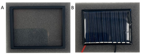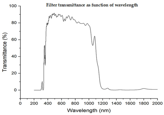 A standard DIY 6V crystalline silicon solar cell was utilized with dimensions of 4.5 cm by 4.5 cm, made from amorphous silicon. A series of experiments were conducted to reduce temperature using a super-cold filter from ASAHI SPECTRA Torrance, CA, USA, catalog number ZSC1100 (see Figure 1). This filter (5.5 cm by 5.5 cm) has a cutoff wavelength of around 1100 nm (see Figure 2). The transmission window of the filter is approximately 90% for wavelengths between 350 and 1000 nm, while monitoring the temperature changes in the cell over time using a thermocouple, under two distinct conditions—in darkness and under illumination. An Oriel Sol3A class AAA provided an illumination solar simulator from Newport Corporation [19] equipped with a 450 W xenon lamp [20]. Figure 3 shows the experimental setup where the filter was put on top of the solar cell covering its entire cell surface inside the solar simulator.