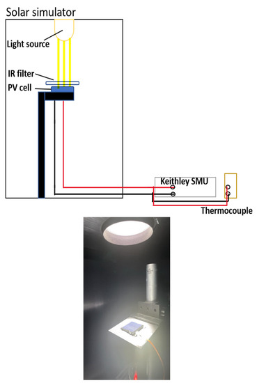 Solar simulator experimental setup: the cell is put under the lamp adjusted at the right height, for a 1.5 AM sun irradiance calibrated using a dedicated photodiode, then connected to a thermocouple through a hole under the metal holing plate. It was then connected to LCR for I–V characteristics. The same test was made with the filter on top of the cell as seen in the top schematics.