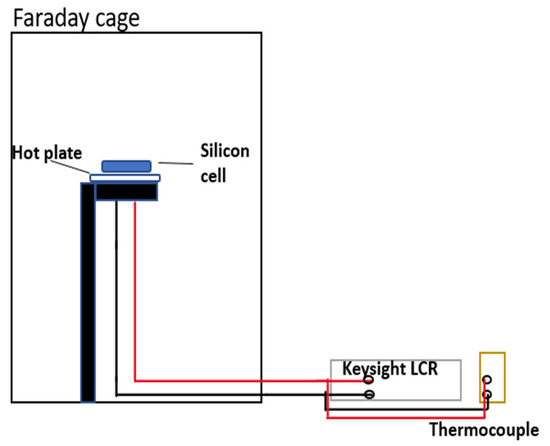 A Keysight LCR meter was used to measure the real (Z’) and imaginary (Z”) components of the device’s impedance and its response to heat in dark conditions. Impedance spectroscopy can shine light on how the cell’s parameters, such as resistance and capacitance, change with temperature; these parameters were then used to analyze the Nyquist curve [21,22,23]. The experimental setup was housed within a Faraday cage to isolate our system from external interference (see Figure 4), given the high sensitivity of our instruments. The solar device was placed inside the cage, and its impedance was evaluated across a range of AC frequencies from 20 Hz to 1 MHz at 1 V, under varying temperatures in the absence of illumination (dark conditions).