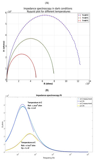 Our observations reveal that the changes in are minimal: at 30 °C and at 60 °C. However, the shunt resistance values decreased significantly from 120 KΩ at 30 °C to 47 KΩ at 60 °C. This reduction in is attributed to the increased concentration of minority carriers in the depletion zone as the temperature rises. Minor changes in capacitance are observed due to an increase in the minority carrier current in the depletion region. Subsequently, we fitted the imaginary part of the cell’s impedance as a function of two temperatures, 30 °C and 60 °C, for the parallel resistor and capacitor (RC) (as shown in Figure 6B). This fitting process aimed to validate our measurements and assess the suitability of this model circuit for our cell. The fitting was based on an article by A. Bouzidi, which provided an equation for the impedance imaginary part [25,26,27]:
