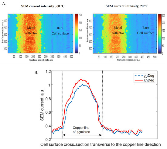Figure 7 presents the SEM current from the solar cell versus the surface coordinates of the cell. The blue color presents the low current intensity of the bare silicon surface. The area of the yellow and red colors presents the metal conductor line on the surface of the cell, showing the increase in current at low voltages close to zero as the temperature rises, a phenomenon observed using the innovative Air-SEM technology. This technology enables us to examine the cell under standard temperature and pressure (STP) conditions. The unique feature of Air-SEM is the absence of a specimen vacuum chamber, which facilitates easy investigation of the temperature’s influence under the cell samples’ load conditions. As depicted in Figure 7, there is a clear increase in current as a function of temperature. This trend is later mirrored in the results of the I–V measurements under illuminated conditions. The ability to observe these changes in real time under standard conditions provides valuable insights into the temperature-dependent behavior of the solar cell and further underscores the potential of Air-SEM technology in this field of study.