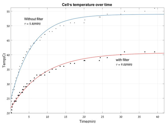The maximum temperatures observed were approximately 10 °C lower with the filter. The time required for the device to reach its maximum temperature (5τ) extended from 25 to 45 min when the filter was used, suggesting that the filter enhances the device’s thermodynamic properties. After 15 min, the cell without the filter reached 50 °C, while in the cell with the filter, it was only 35 °C, a difference of 15 °C. This difference persisted for 30 min until both reached their maximum temperatures after roughly 50 min. The maximum temperature difference observed was 12 °C (see Figure 8). These findings confirm that the filter operates as anticipated, helping to maintain lower cell temperatures by filtering out some radiation that does not contribute to the current. These results align with those of Asmaa Ahmed [13], who also demonstrated that an effective filter can improve solar efficiency for silicon devices. The drop in the open-circuit voltage () is significantly influenced by the bandgap reduction (see Equation (4)), which is directly related to temperature. These energy losses and heat transfer effects can substantially diminish the device’s efficiency, leading to an efficiency drop of about 0.5% for a 1 °C rise (as per Equation (4)). We aim to minimize these effects by filtering out unnecessary IR wavelengths, which, in the case of silicon, do not contribute to electricity production.