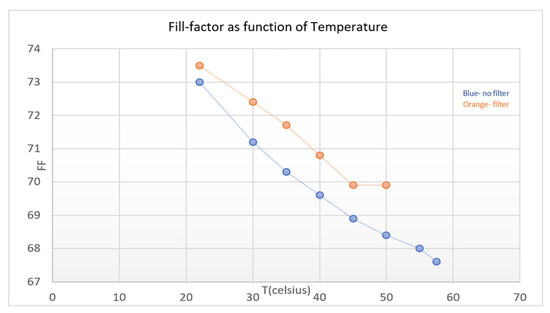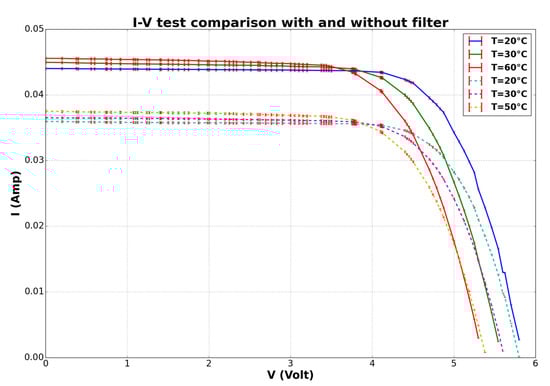 The results were calculated from the I–V curve presented in Figure 9 using I–V Software calculating the parameters as is intersecting with the x axis. Table 1 shows the changes in parameters; we can see that there is a rise in the FF. This happens because is higher with the filter due to the lower temperatures and lower shunt ressistance. Equation (4) demonstrates how is affected by this temperature difference. Therefore, even when the MPP drops due to the current drop caused by the filter transmittance, the squareness of the I–V curve is better, which is what the FF is representing and is linearly connected to efficiency.