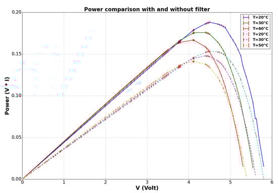 Cell power output with and without the filter: comparison—corresponding to the I–V in Figure 9. The solid lines represent the power without the filter showing the drop in power with temperature. The dashed lines show the same with a right shift of the MPP indicating an efficiency increase; the error bars were calculated with the same method.