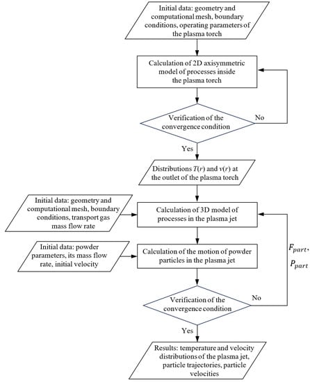 From the description, it follows that the mathematical model of the process under consideration is quite complex, and should include both processes inside the arc plasma torch and processes in the area of the plasma jet. At the same time, the arc plasma torch with IEI as a whole has an axial symmetry. Therefore, for simplicity, the task is divided into two parts. A flowchart of the numerical model is shown in Figure 2.