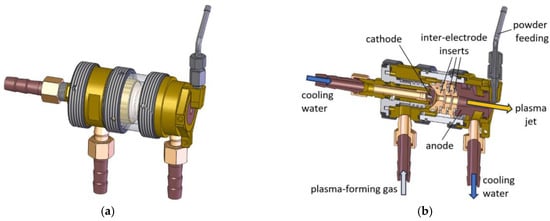A general view of the arc plasma torch for the calculation and its cut are shown in Figure 3. The mode of the operation and design of the plasma torch were set as identical to the ones in the experimental setup (for which experimental data were obtained).
