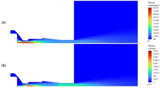 As a result of the calculation, two-dimensional distributions of the temperature, velocity, and other values were obtained. Examples of the obtained results for the case of the plasma gas flow rate G = 1.0 g/s are shown in Figure 5.